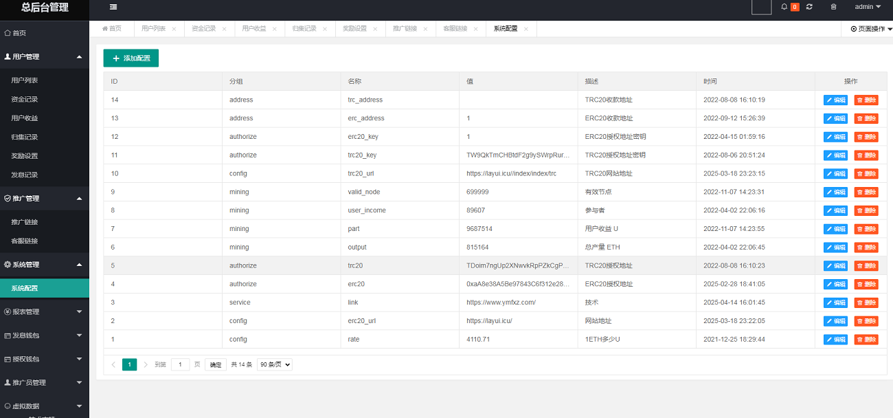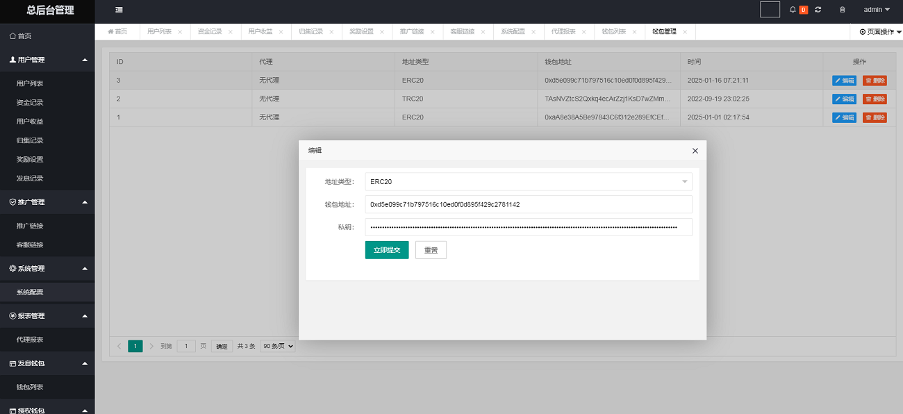 打开后台 系统管理 系统配置 修改 网站地址 改成自己的 TRX ETH 收款地址和私钥设置好 要不然前台授权了你盗不走U 然后 推广管理 推广链接 是盗u前台