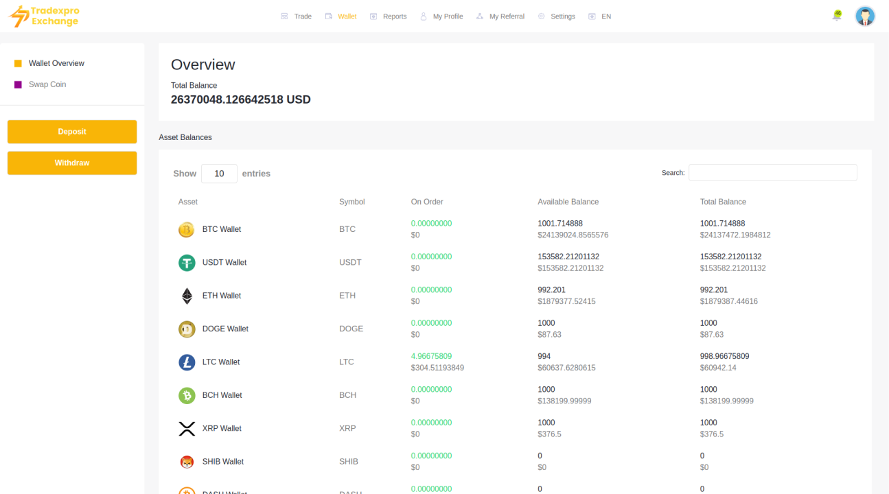 平台功能涵盖加密货币支付 买入 卖出 限价止损 存取款 推荐系统 多语言支持等常用模块 用户可在交易系统中根据价格偏好挂单交易 在钱包部分可实时查看余额和交易状态 同时提供充值提现记录等详细数据。